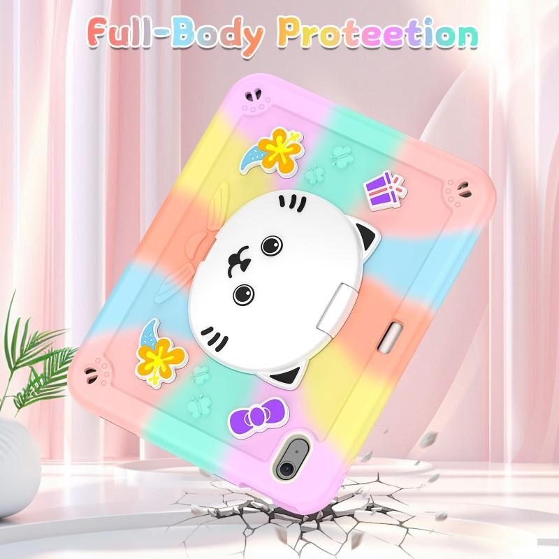 For iPad Air 11 2025 / 2024 Cat Holder Silicone Hybrid PC Tablet Case with Strap(Colorful Rose Gold)