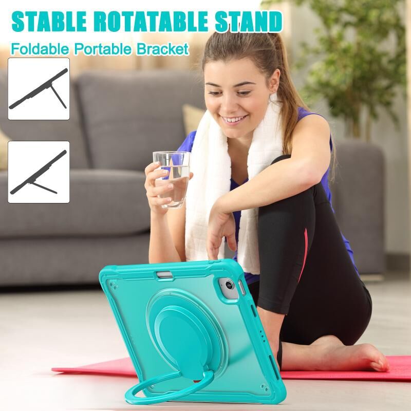 3. Adjustable Shoulder Strap: Adjustable shoulder grip can be slanted and release your hands completely. This function is perfect for traveling, restaurant ordering, home product introduction, engineer outdoor operation, teacher, etc. Also, the strap allows you to hang up your tablet behind car seat for entertainment for kids.