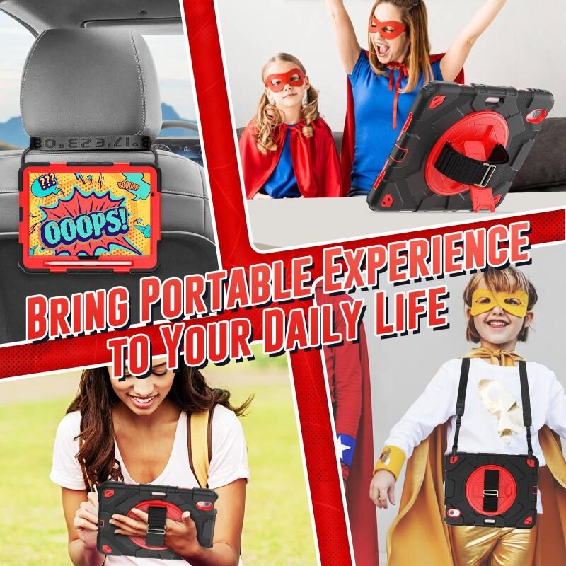6. Detachable Shoulder Strap: The adjustable hand strap provides easy and comfortable grip, a must-have feature when you are presenting your tablet to others. The detachable and adjustable shoulder strap can help you carry your tablet more safely while hiking, traveling and other outdoor activities. This can also be used to secure your tablet to the car seat.