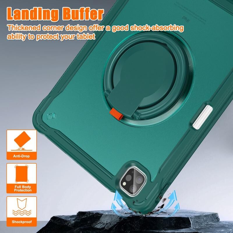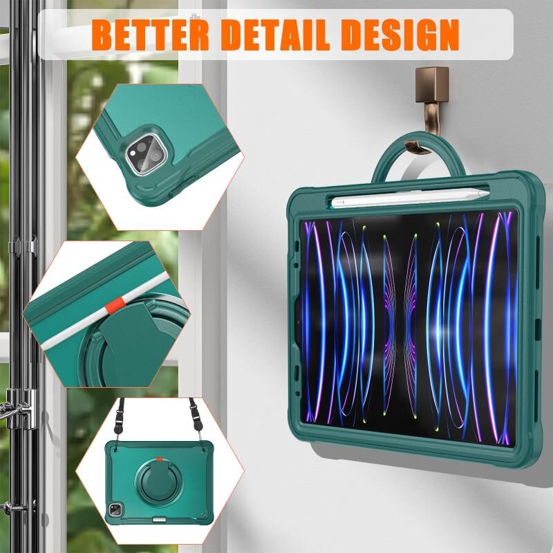 For iPad Air 2022 10.9 / Pro 11 2022 Heavy Duty Hybrid Tablet Case with Handle & Strap(Dark Green)