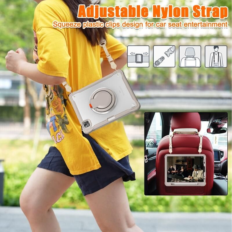 3. Adjustable Shoulder Strap: Adjustable shoulder grip can be slanted and release your hands completely. This function is perfect for traveling, restaurant ordering, home product introduction, engineer outdoor operation, teacher, etc. Also, the strap allows you to hang up your tablet behind car seat for entertainment for kids.