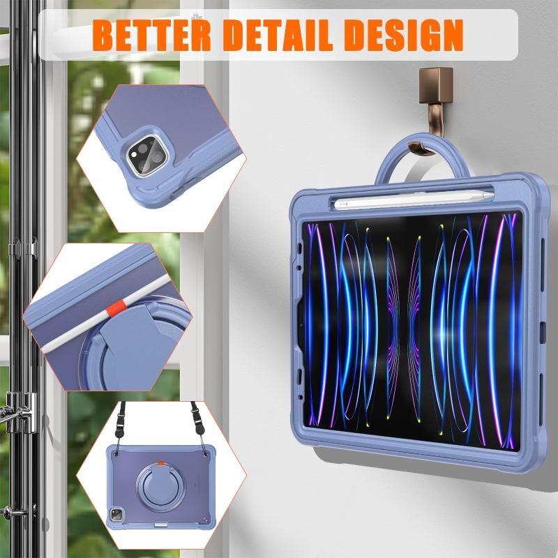 3. Adjustable Shoulder Strap: Adjustable shoulder grip can be slanted and release your hands completely. This function is perfect for traveling, restaurant ordering, home product introduction, engineer outdoor operation, teacher, etc. Also, the strap allows you to hang up your tablet behind car seat for entertainment for kids.