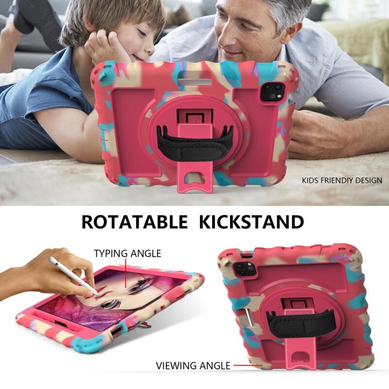 Για iPad Air 2022 / 2020 10.9 Περιστρεφόμενη θήκη 360 μοιρών από PC + Σιλικόνη, ανθεκτική σε κρούσεις, σε συνδυασμό με βάση στήριξης & λουρί χειρός & λουρί λαιμού & θήκη για στυλό (Πολύχρωμη + Φούξια)