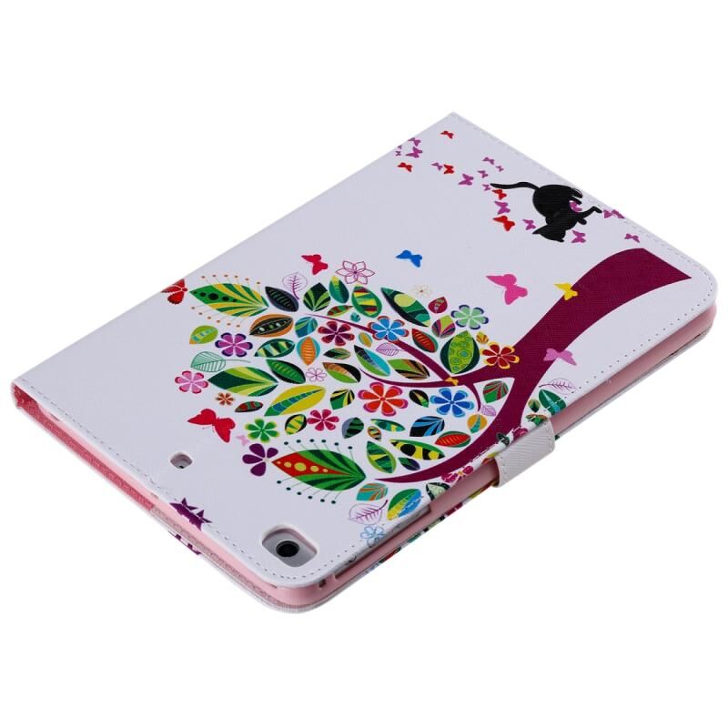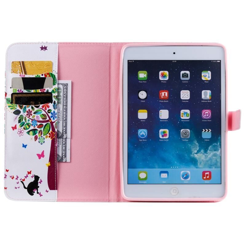 Θήκη δερμάτινη με οριζόντια αναδίπλωση 3D με σχέδια και χρώματα για iPad Mini 2019 & 4 & 3 & 2 & 1, με βάση στήριξης, θήκες για κάρτες, πορτοφόλι και λειτουργία αυτόματης αφύπνισης/ύπνου (Γάτα και Δέντρο)