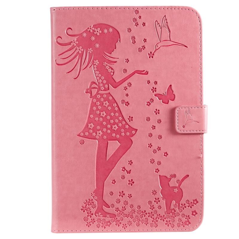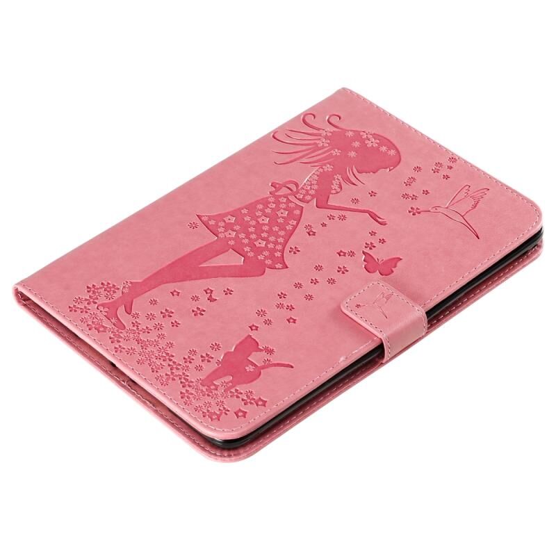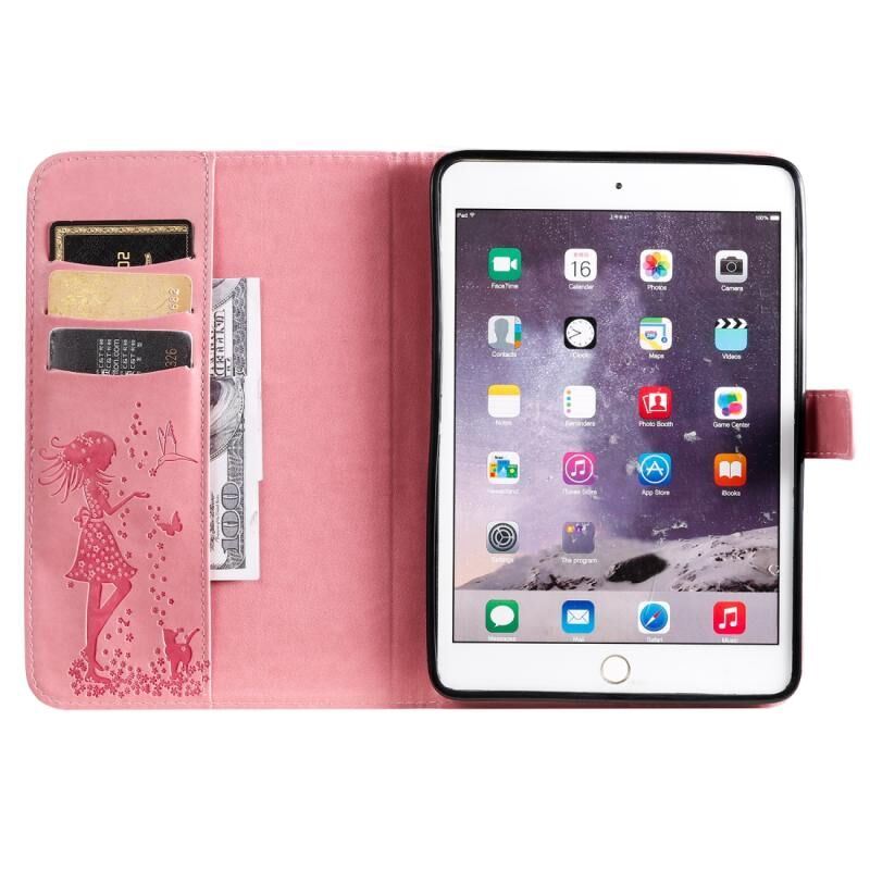 Θήκη δέρματος οριζόντιας αναδίπλωσης με σχέδιο γυναίκας και γάτας με εκτύπωση για iPad Mini 2019 & 4 & 3 & 2 & 1, με βάση στήριξης & υποδοχές καρτών & πορτοφόλι (Χρυσό ροζ)