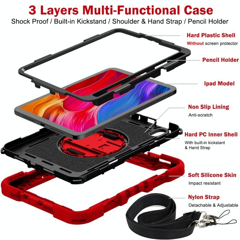 For iPad mini 2024 / mini 6 360 Degree Rotation Contrast Color Shockproof Silicone + PC Tablet Case with Holder & Hand Grip Strap & Shoulder Strap(Red+Black)