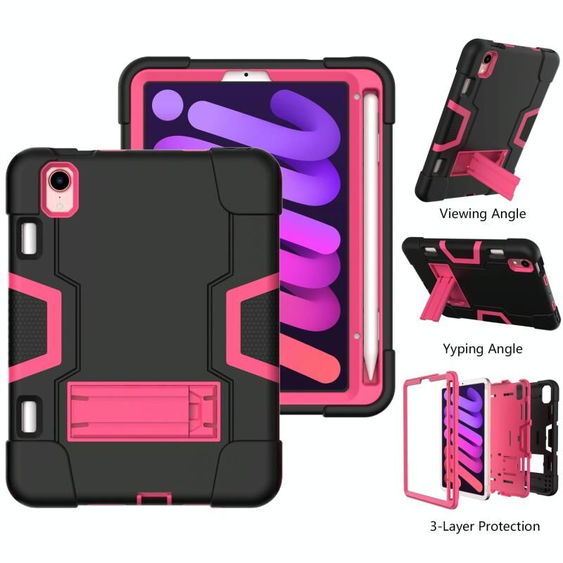 For iPad mini 2024 / mini 6 Contrast Color Robot Shockproof Silicone + PC Protective Tablet Case with Holder & Pen Slot(Black Rose Red)