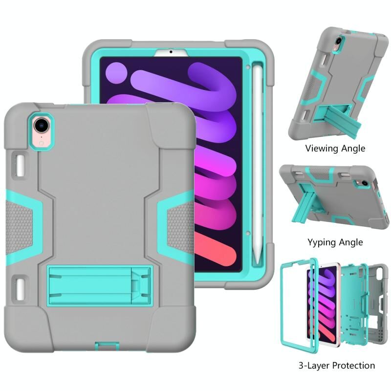 For iPad mini 2024 / mini 6 Contrast Color Robot Shockproof Silicone + PC Protective Tablet Case with Holder & Pen Slot(Grey Mint Green)