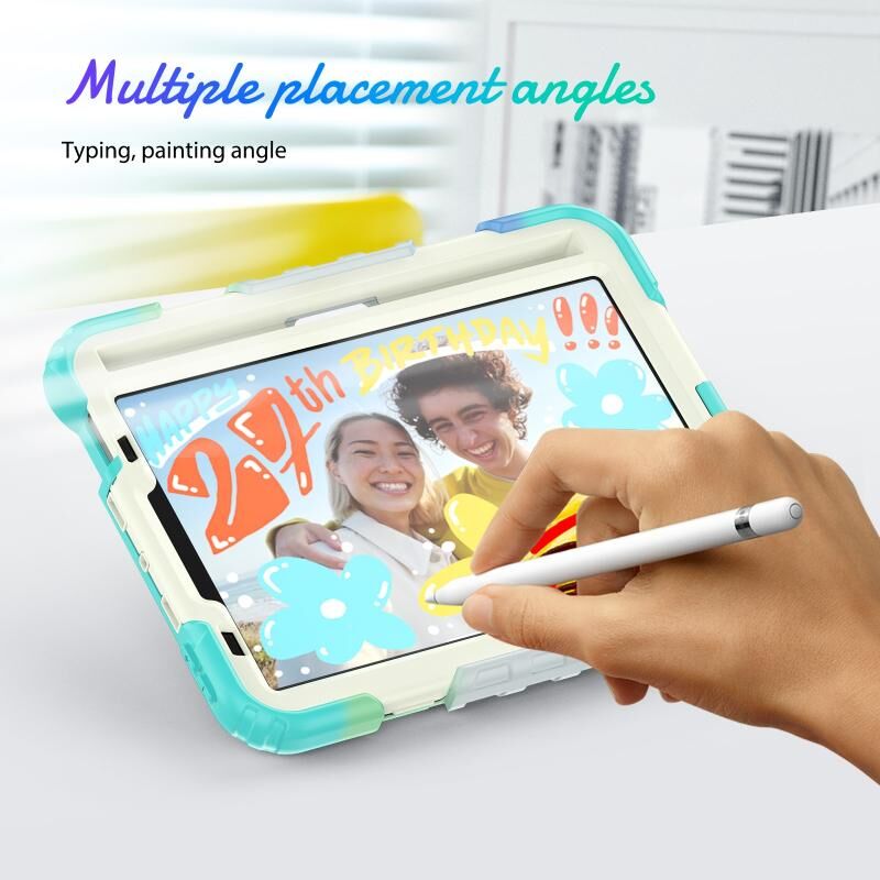 For iPad mini 2024 / mini 6 Shockproof Silicone + PC Protective Tablet Case with Holder & Shoulder Strap & Pen Slot(Beige + Camouflage Blue)
