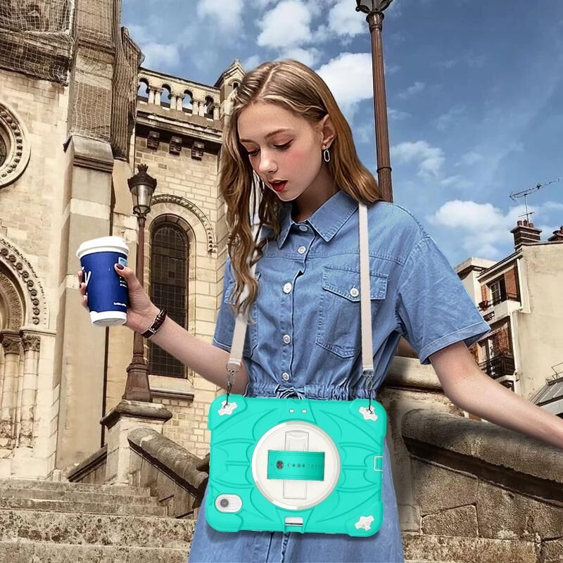 6. Detachable Shoulder Strap: The adjustable hand strap provides easy and comfortable grip, a must-have feature when you are presenting your tablet to others. The detachable and adjustable shoulder strap can help you carry your tablet more safely while hiking, traveling and other outdoor activities. This can also be used to secure your tablet to the car seat.