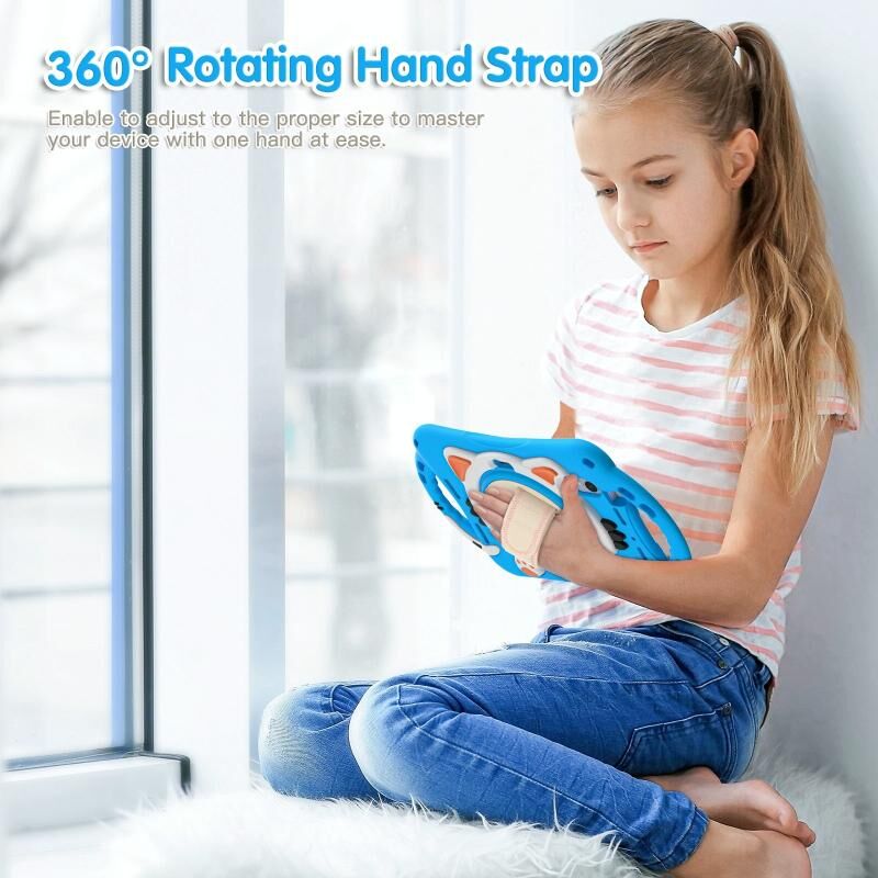 For iPad mini 6 / mini 2024 Cute Cat King Kids Shockproof Silicone Tablet Case with Holder & Shoulder Strap & Handle(Light Blue)