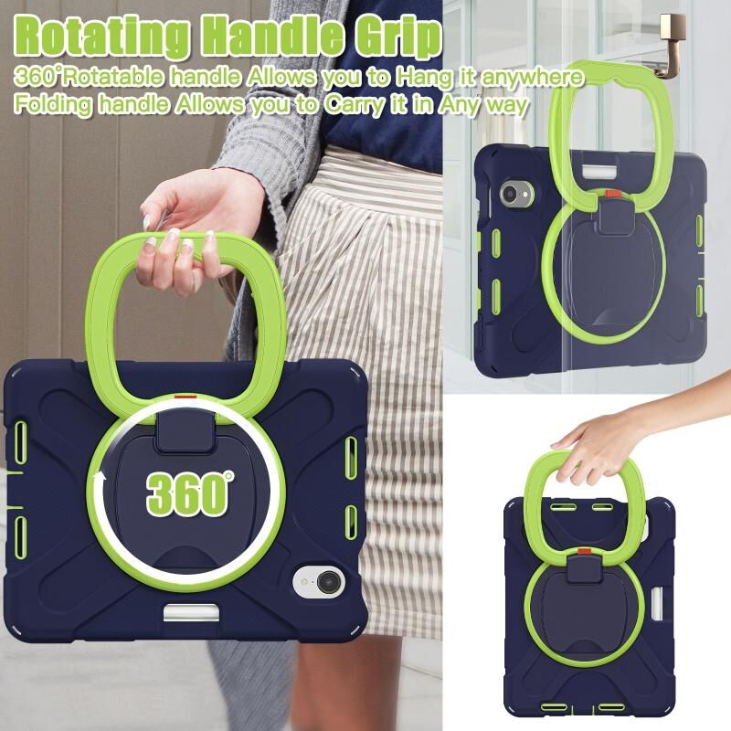 For iPad mini 6 / mini 2024 Heavy Duty Silicone Hybrid PC Tablet Case with Holder & Shoulder Strap(Navy Blue + Lime)