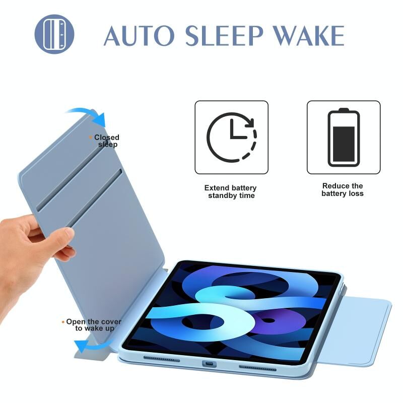 3. Αυτόματη Λειτουργία Ύπνου/Αφύπνισης: Το μαγνητικό έξυπνο κάλυμμα υποστηρίζει τη λειτουργία αυτόματης αφύπνισης/ύπνου για εξοικονόμηση μεγάλης ποσότητας ενέργειας και παράταση της ζωής του tablet σας. Ο ισχυρός μαγνήτης εξασφαλίζει το κλείσιμο της θήκης, εύκολο στην τοποθέτηση και αφαίρεση.