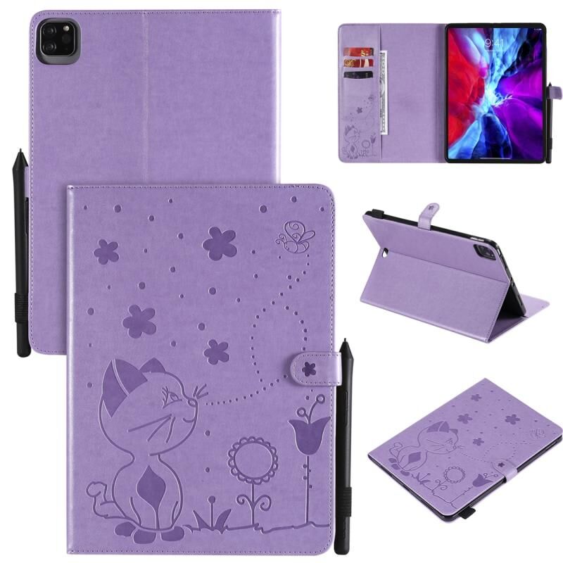 Θήκη tablet από δέρμα με οριζόντιο άνοιγμα για iPad Pro 11 (2020) & (2018) με σχέδιο ανάγλυφου γάτας και μέλισσας, με βάση στήριξης, θήκες για κάρτες, πορτοφόλι, θήκη για στυλό & λειτουργία αφύπνισης / ύπνου (Μωβ)