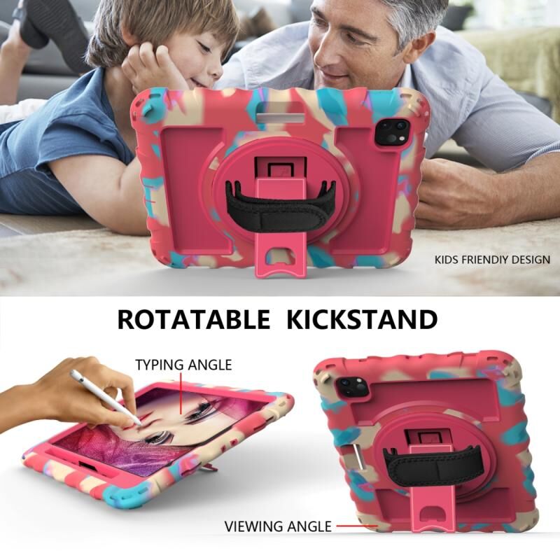Για iPad Pro 11 (2020) Υπολογιστής + Συνδυασμός Θήκης Ταμπλέτας από Σιλικόνη Ανθεκτική στις Κραδασμούς με Περιστρεφόμενη Βάση 360 Μοιρών & Λαβή (Πολύχρωμο + Φούξια)