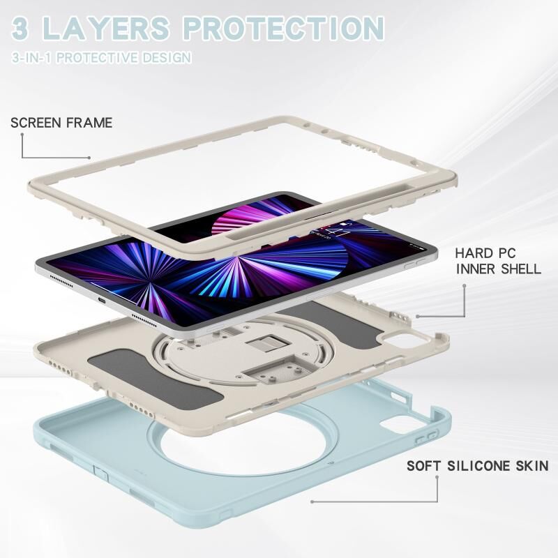 Για iPad Pro 11 2022 / 2021 / 2020 / 2018, θήκη προστασίας tablet από PC + TPU με περιστροφή 360 μοιρών, με βάση στήριξης, λουρί χειρός & υποδοχή για στυλό (Ροζ άνθη κερασιάς)