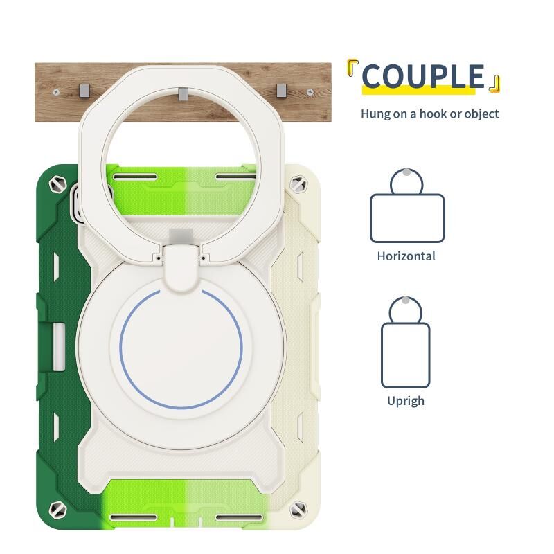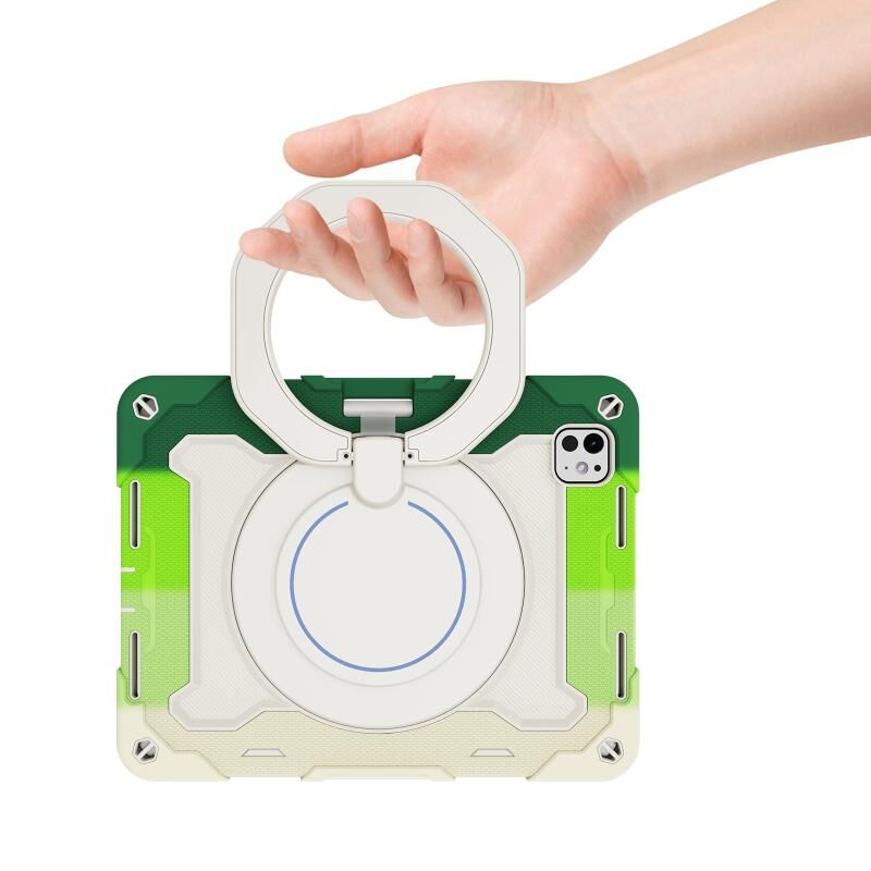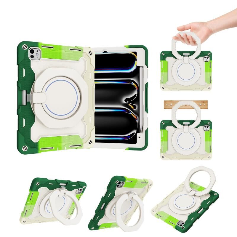 For iPad Pro 11 2024 Armor Portable Rotating Ring Holder Silicone Tablet Case with Pen Slot(Colorful Green)