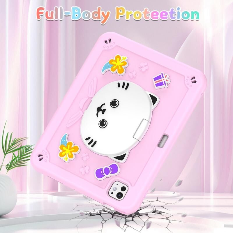 For iPad Pro 11 2024 Cat Holder Silicone Hybrid PC Tablet Case with Strap(Cherry Blossom Pink)