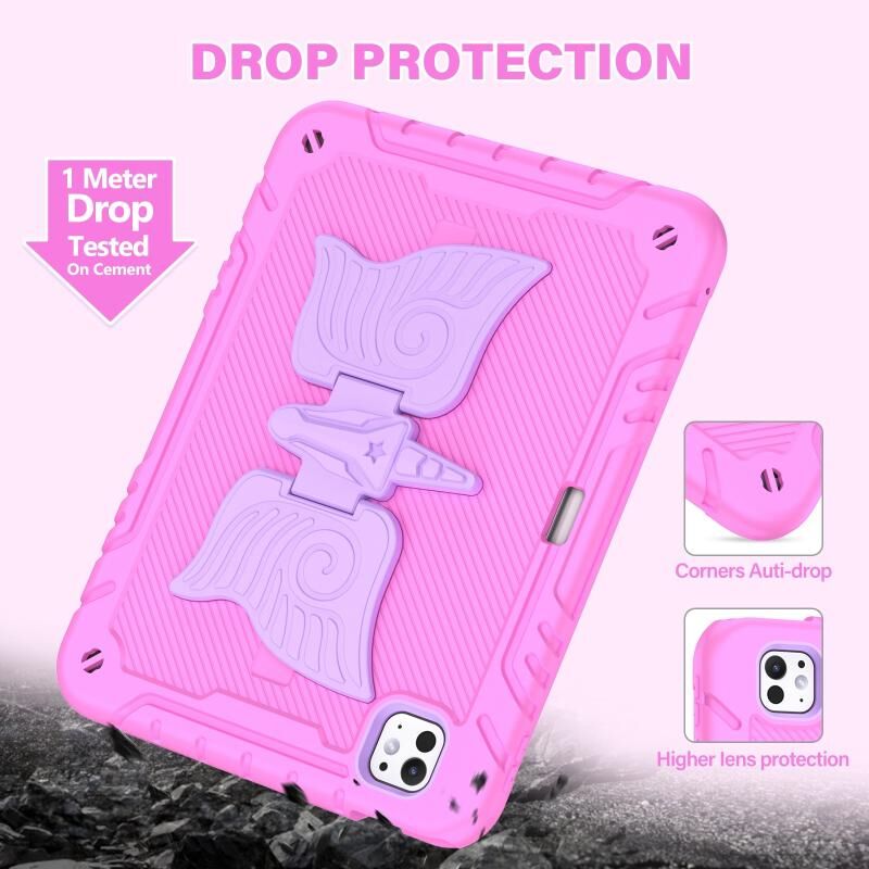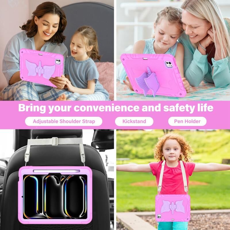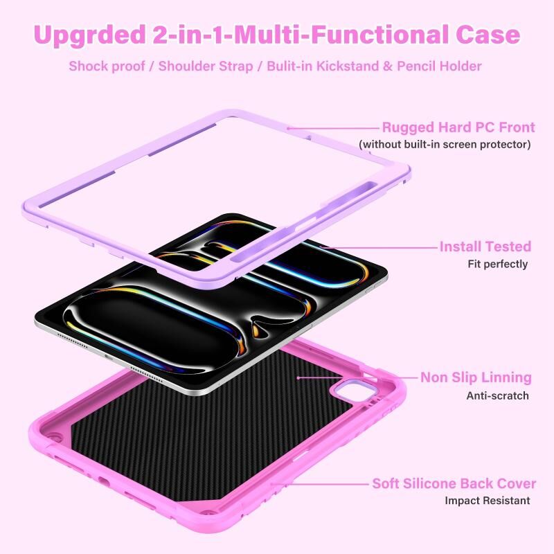 For iPad Pro 11 2024 Kickstand PC Hybrid Silicone Tablet Case with Strap(Pink Purple)
