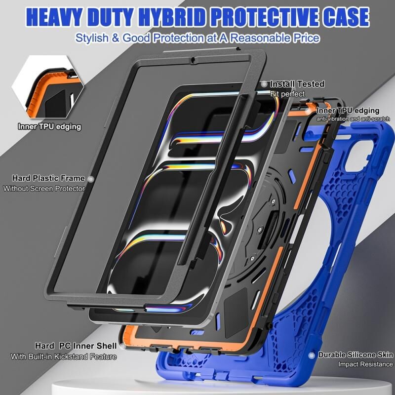 For iPad Pro 11 2024 Rotatable Holder Silicone Hybrid PC Tablet Case with Shoulder Strap(Blue)