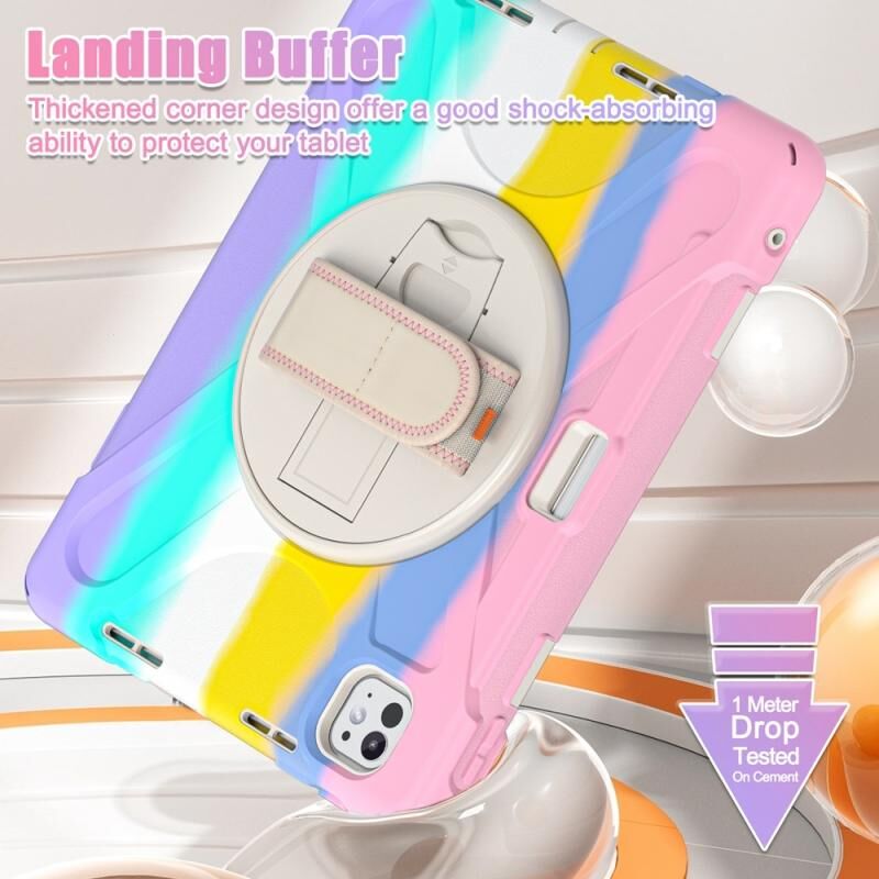 For iPad Pro 11 2024 Rotatable Holder Silicone Hybrid PC Tablet Case with Shoulder Strap(Colorful Pink)
