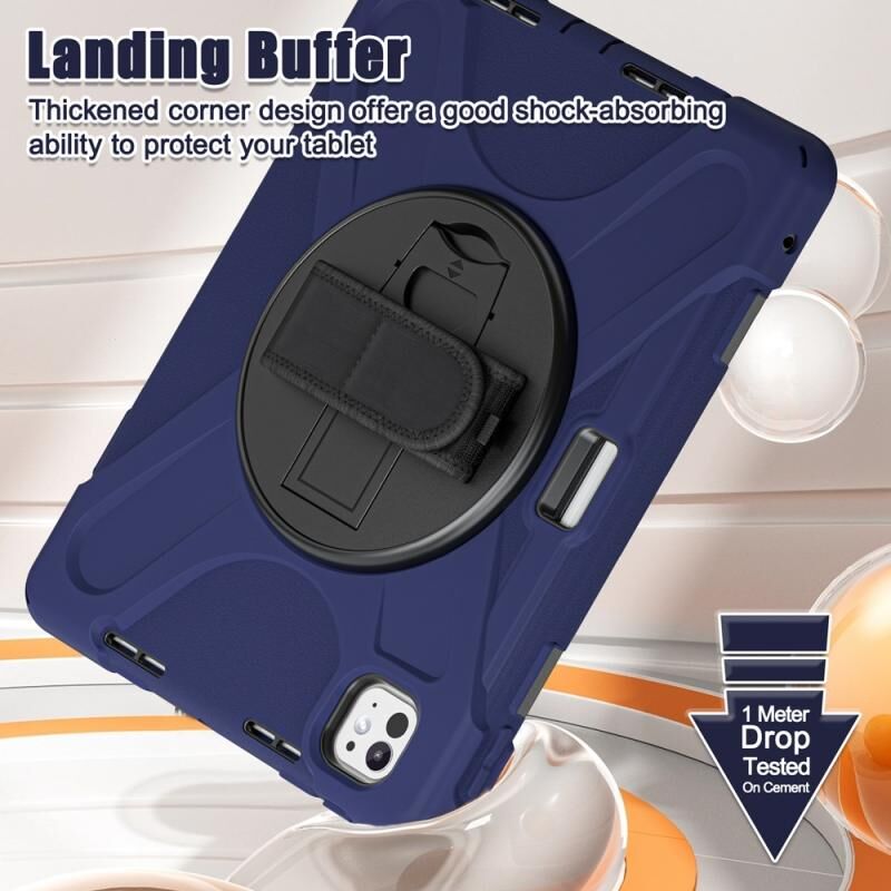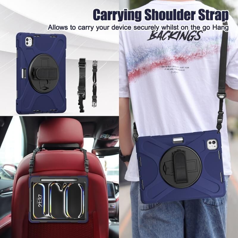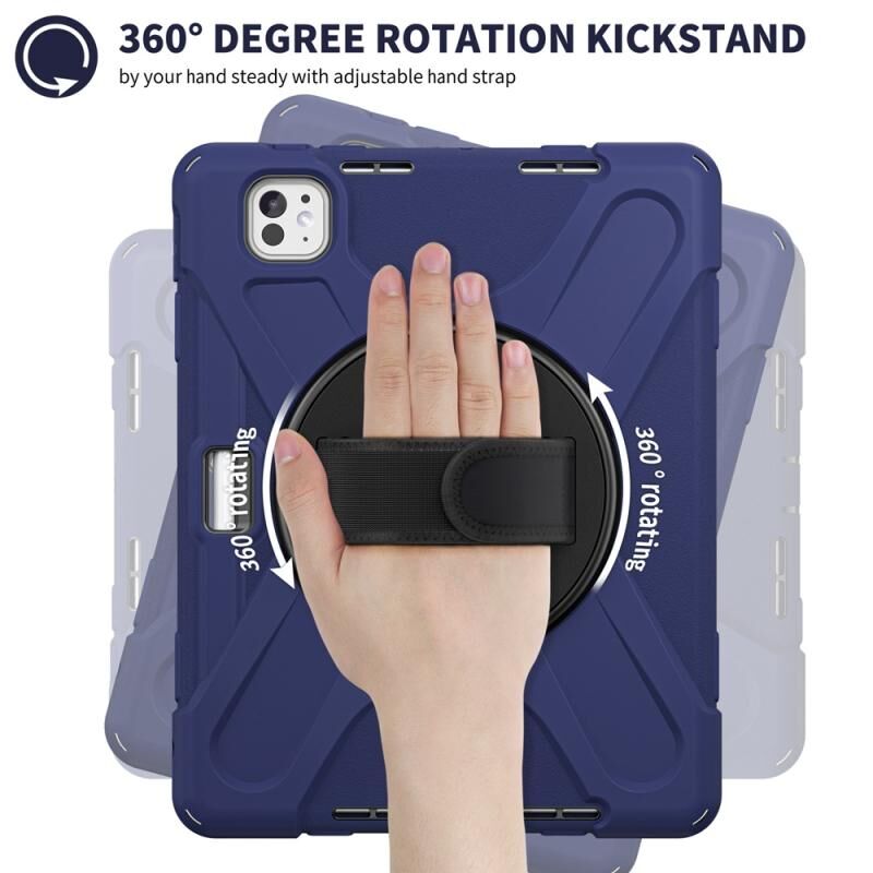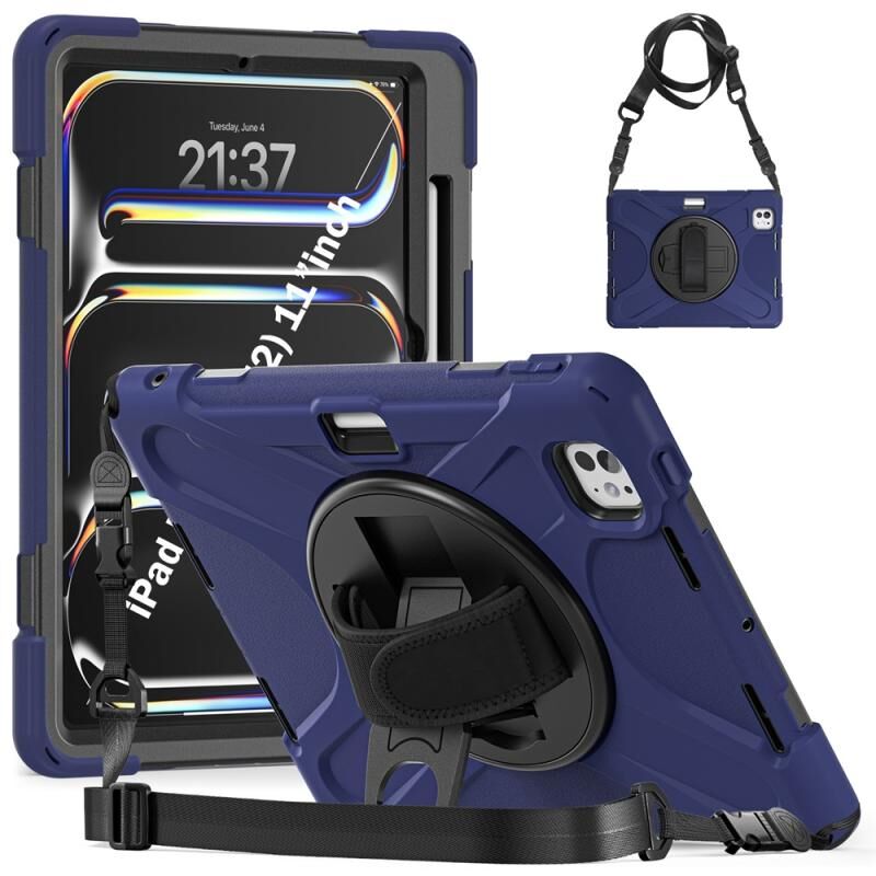 For iPad Pro 11 2024 Rotatable Holder Silicone Hybrid PC Tablet Case with Shoulder Strap(Navy Blue)