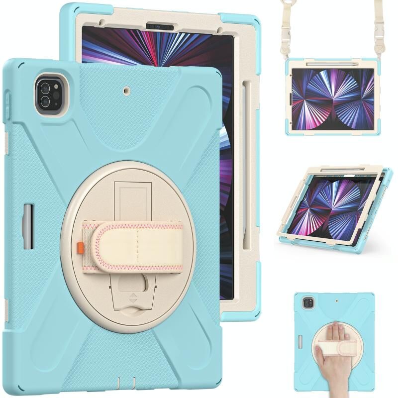 For iPad Pro 12.9 2022 / 2021 Rotatable Holder Silicone Hybrid PC Tablet Case with Shoulder Strap(Ice Blue)