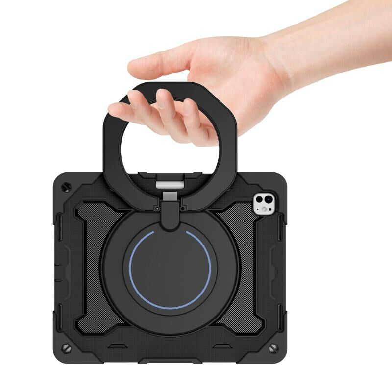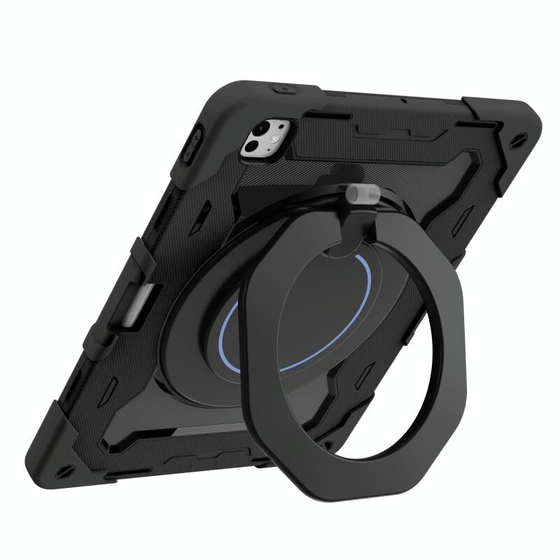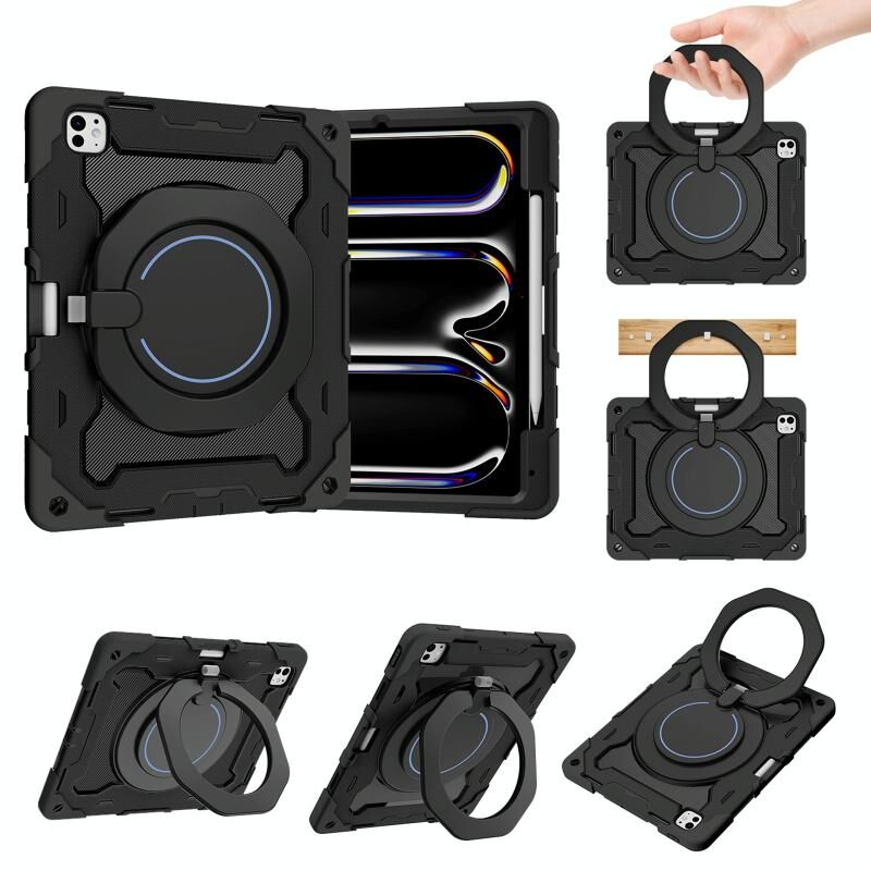 For iPad Pro 13 2024 Armor Portable Rotating Ring Holder Silicone Tablet Case with Pen Slot(Black)