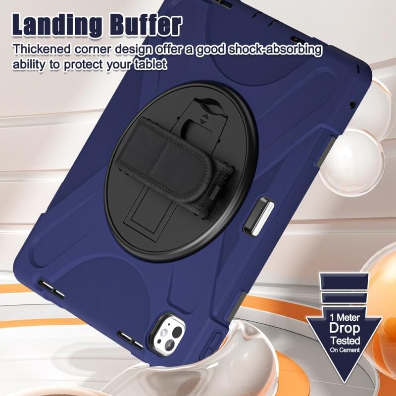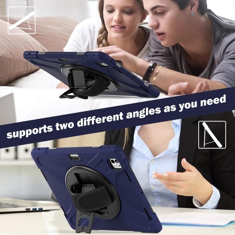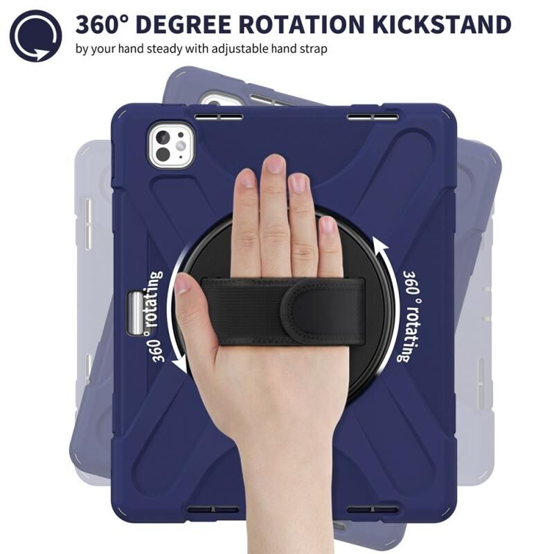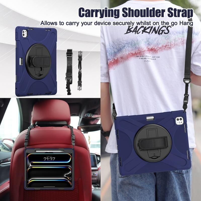 For iPad Pro 13 2024 Rotatable Holder Silicone Hybrid PC Tablet Case with Shoulder Strap(Navy Blue)