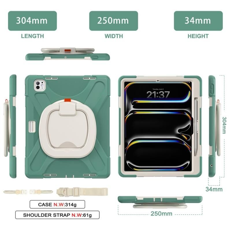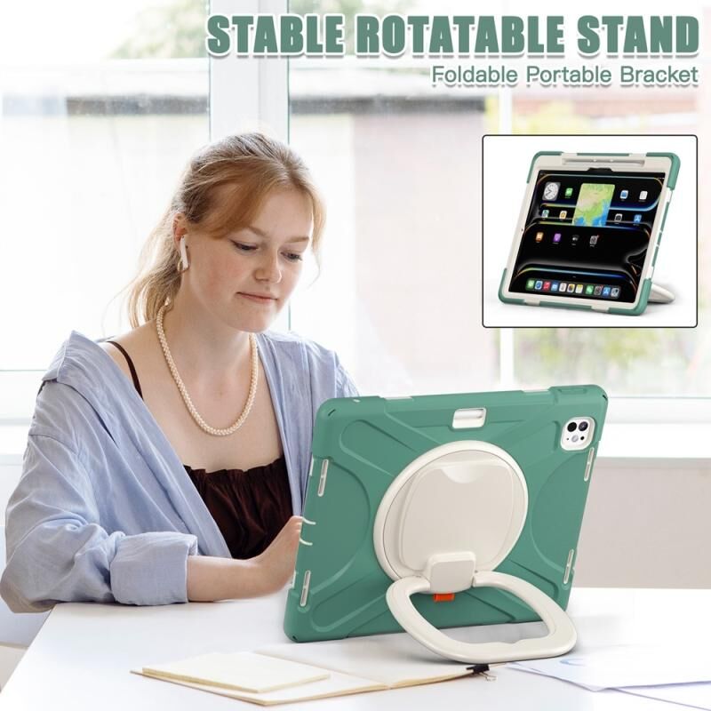 For iPad Pro 13 2024 Silicone Hybrid PC Tablet Case with Holder & Shoulder Strap(Emerald Green)