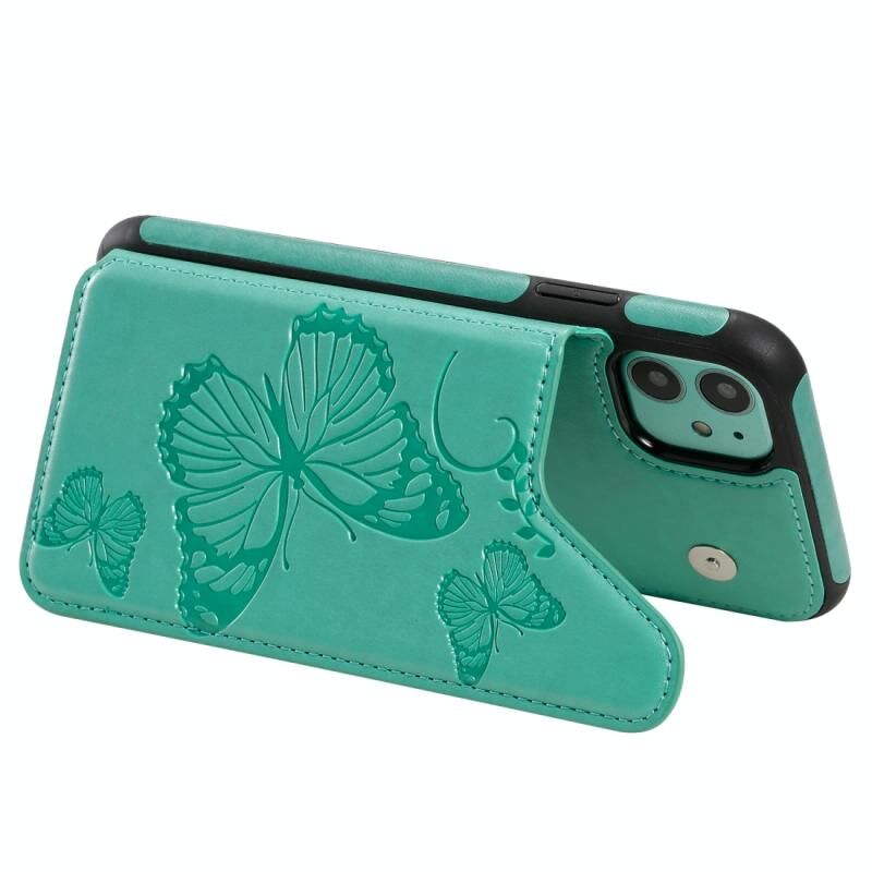For iPhone 11 Butterfly Embossing Pattern Shockproof Protective Case with Holder & Card Slots & Photo Frame(Green)
