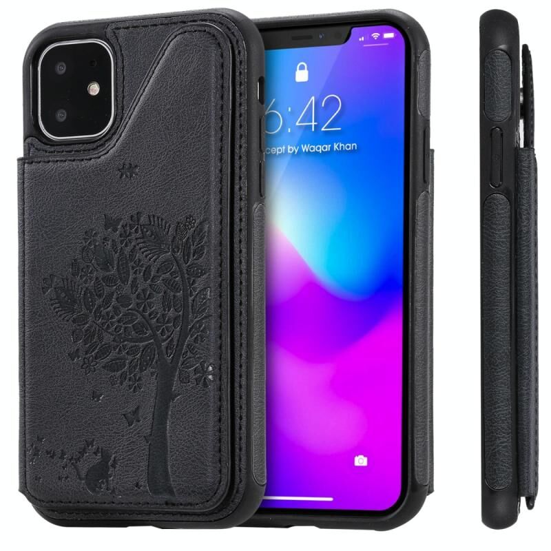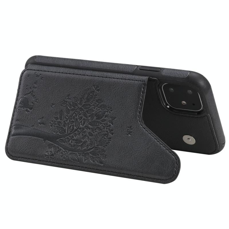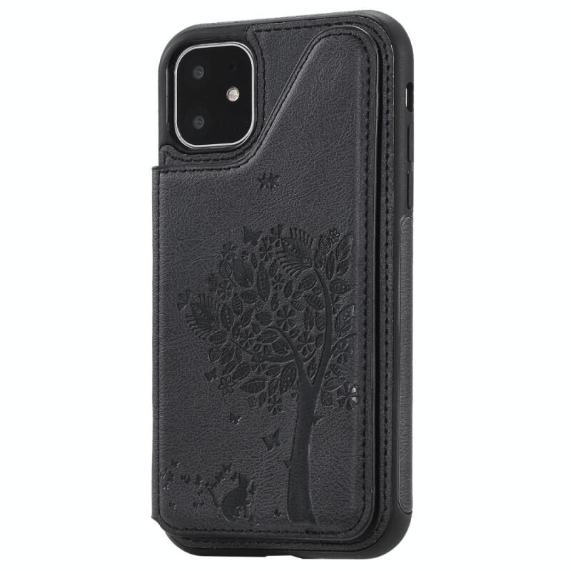 For iPhone 11 Cat Tree Embossing Pattern Shockproof Protective Case with Card Slots & Photo Frame & Holder(Black)