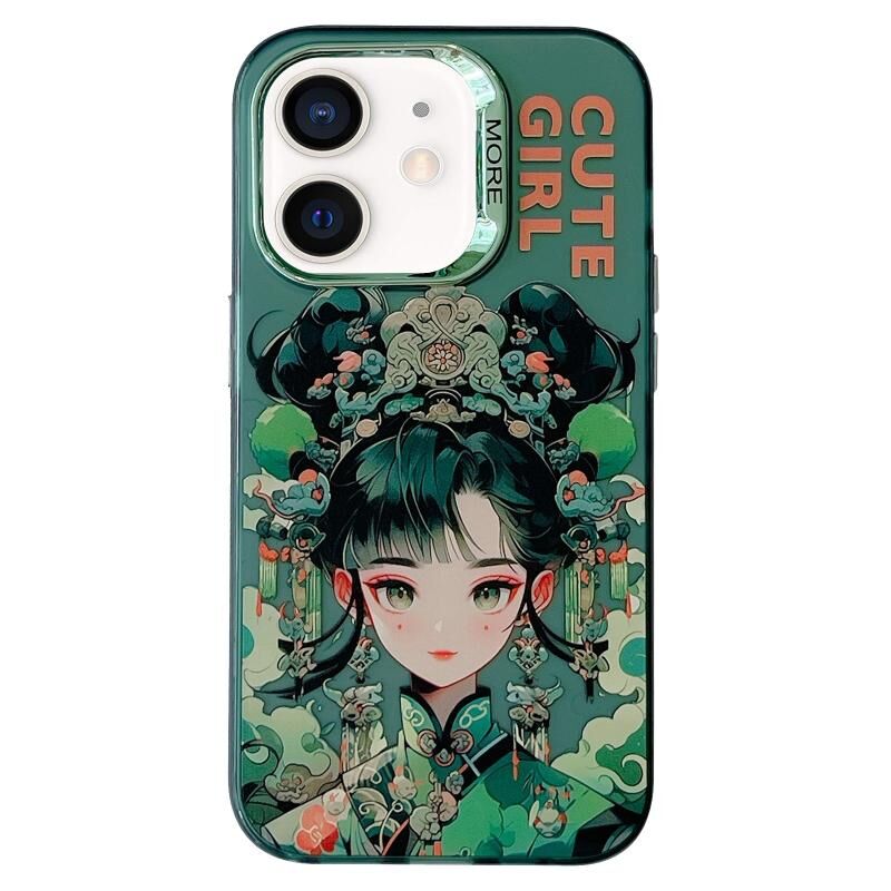 For iPhone 11 Chinese Ancient Style Electroplated Lens Ring PC Hybrid TPU Phone Case(Green Background Girl)