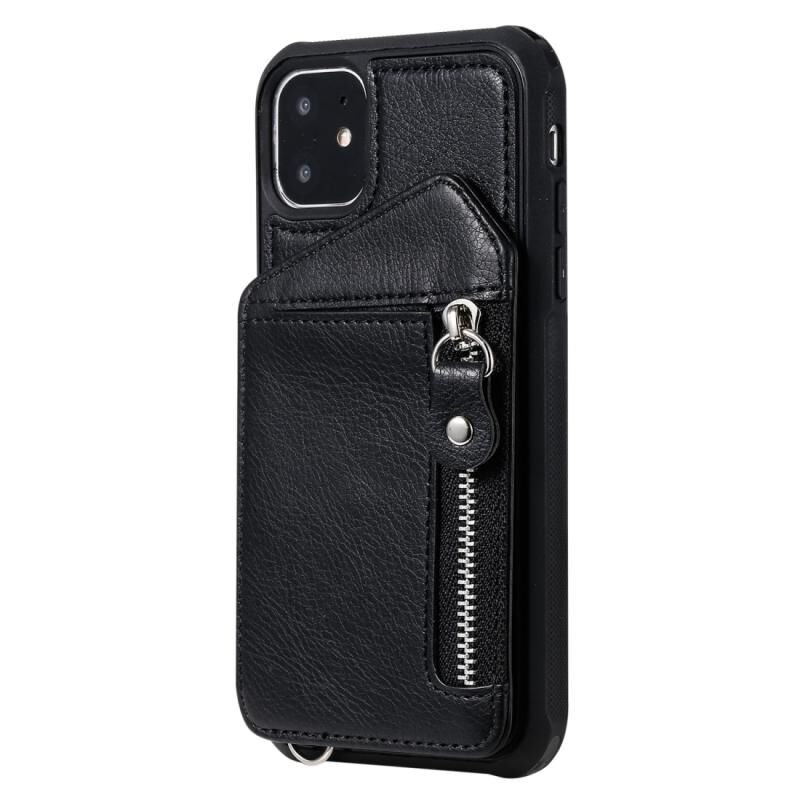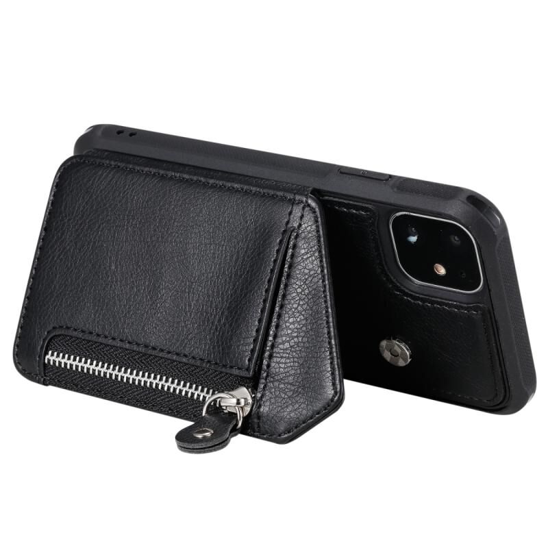 For iPhone 11 Dual Buckles Zipper Shockproof Back Cover Protective Case with Holder & Card Slots & Wallet & Lanyard & Photos Frames(Black)
