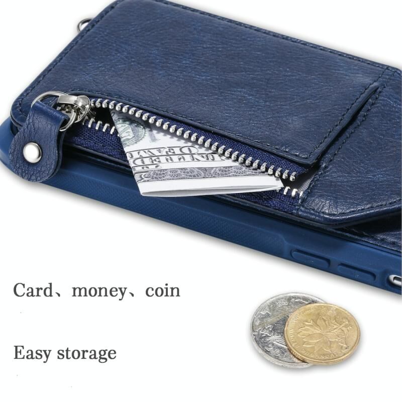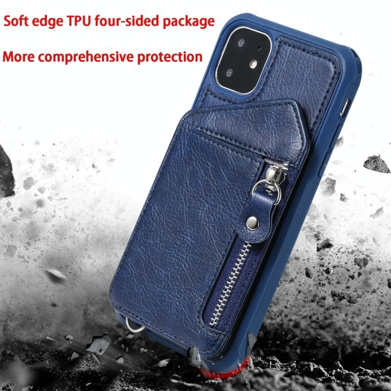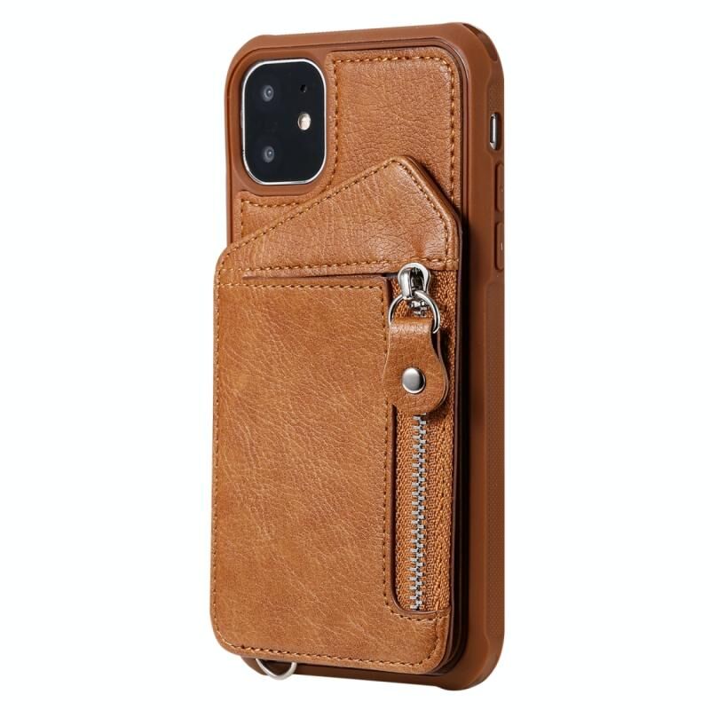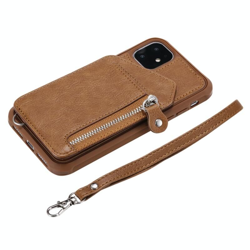For iPhone 11 Dual Buckles Zipper Shockproof Back Cover Protective Case with Holder & Card Slots & Wallet & Lanyard & Photos Frames(Coffee)