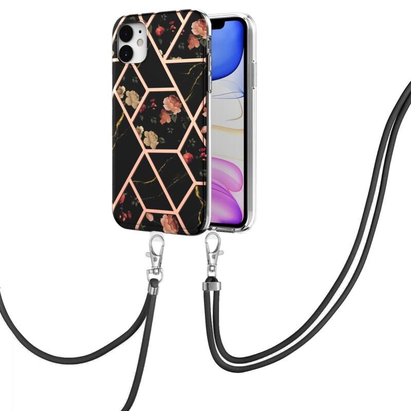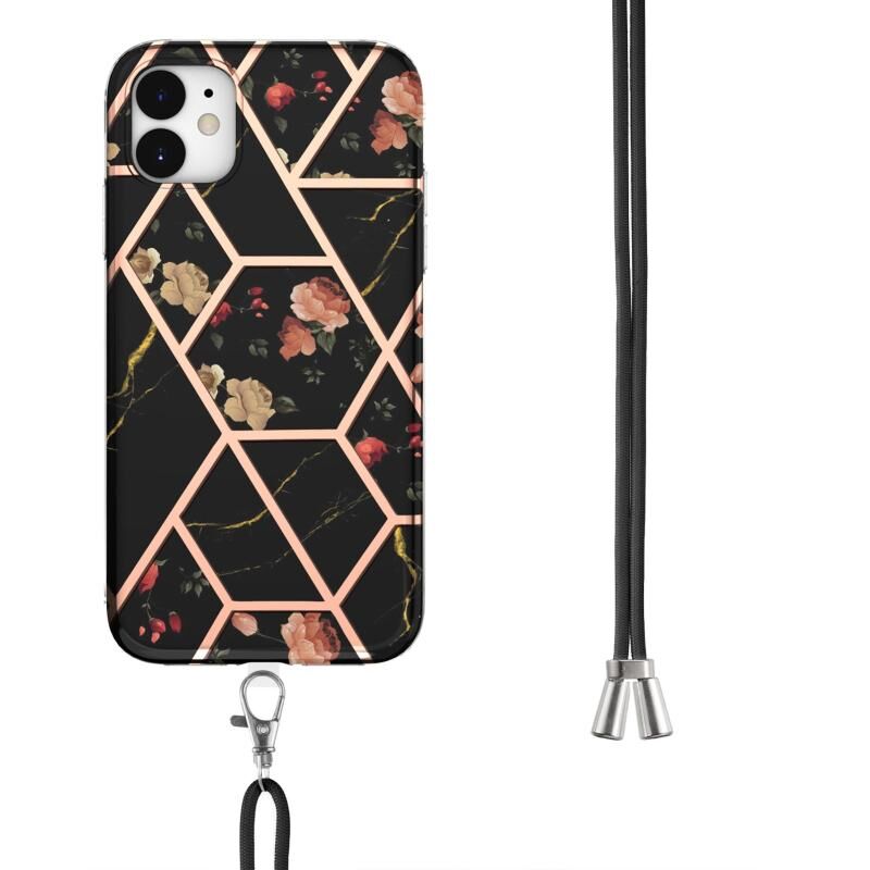 For iPhone 11 Electroplating Splicing Marble Flower Pattern TPU Shockproof Case with Lanyard (Black Flower)