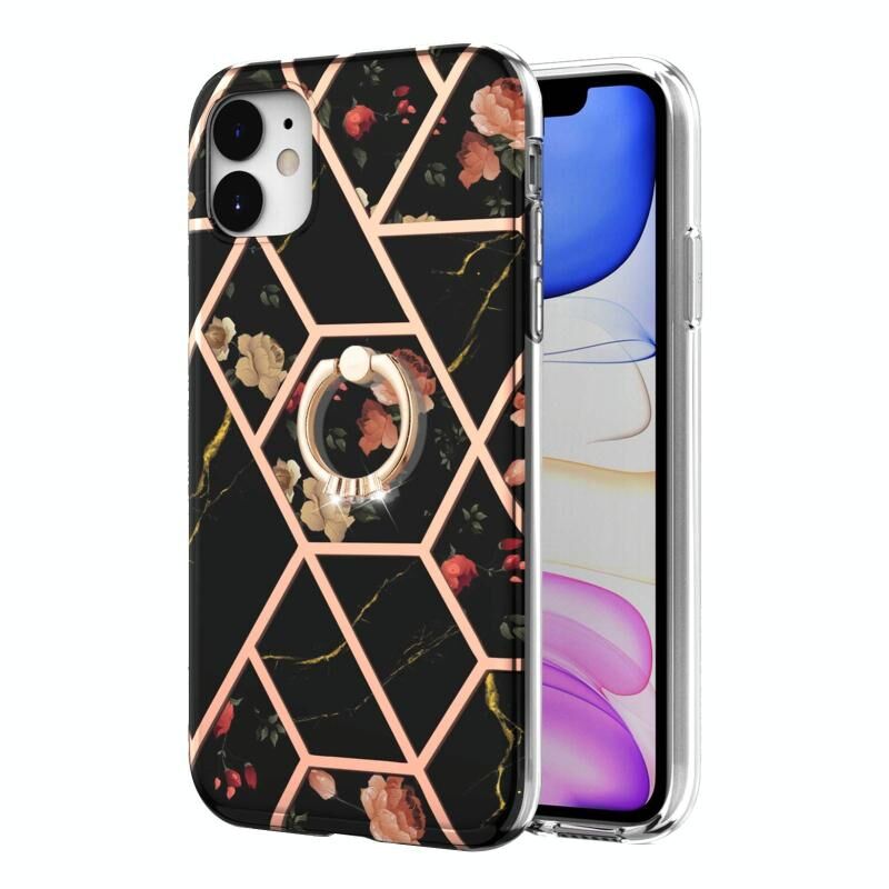For iPhone 11 Electroplating Splicing Marble Flower Pattern TPU Shockproof Case with Rhinestone Ring Holder (Black Flower)
