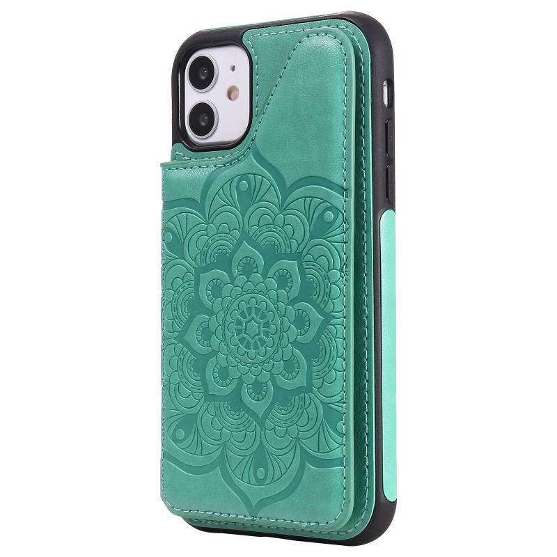 For iPhone 11 Flower Embossing Pattern Shockproof Protective Case with Holder & Card Slots & Photo Frame (Green)