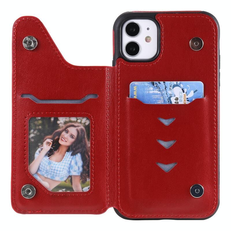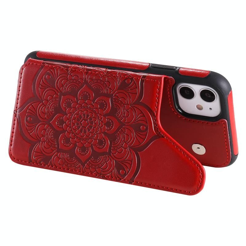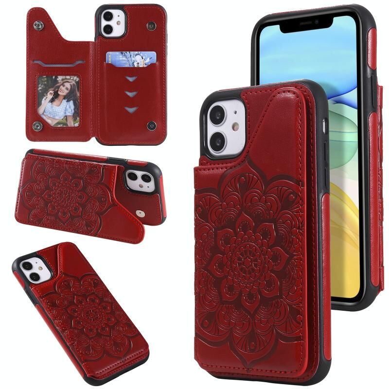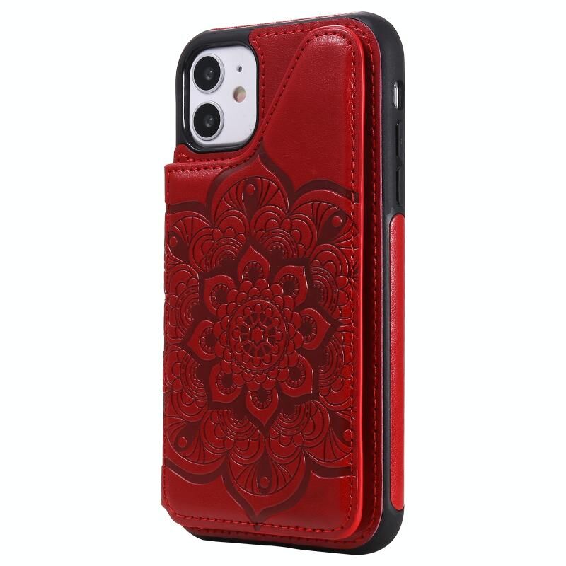 For iPhone 11 Flower Embossing Pattern Shockproof Protective Case with Holder & Card Slots & Photo Frame (Red)