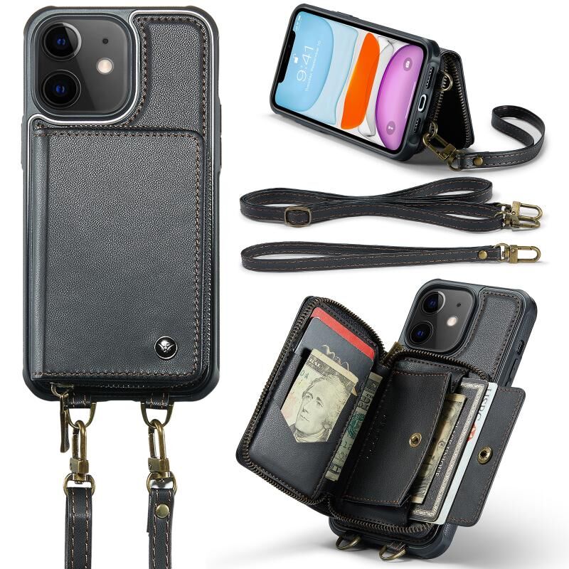 For iPhone 11 JEEHOOD C22 Series Zipper Wallet Leather Phone Case with Dual Lanyard(Black) (JEEHOOD)