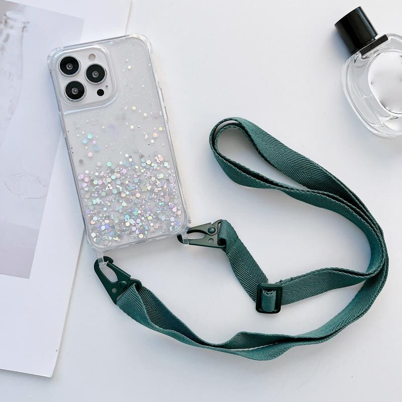 For iPhone 11 Lanyard Glitter Epoxy Clear Phone Case (Dark Green)