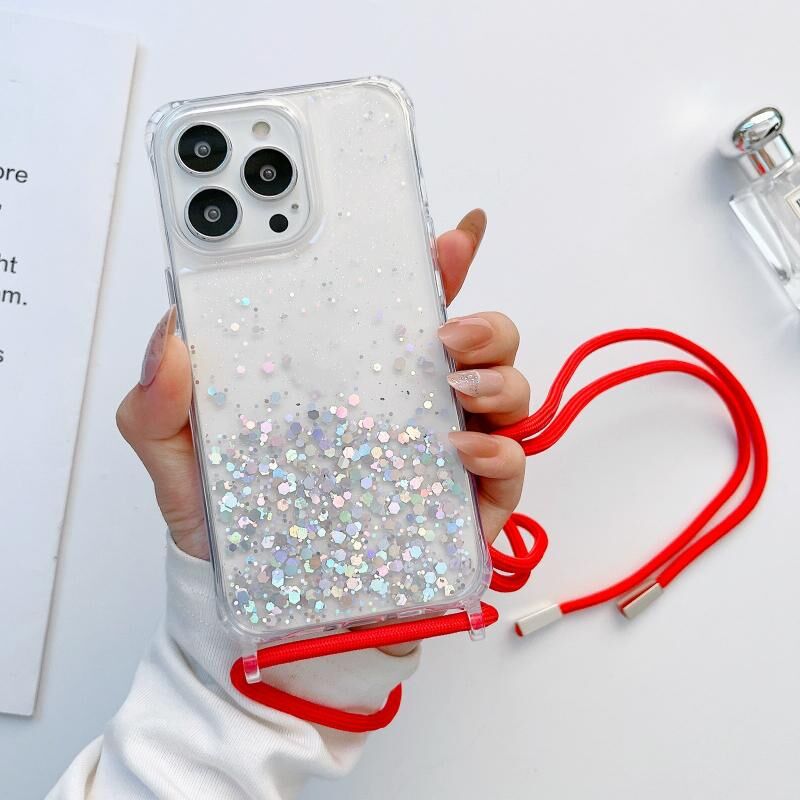 For iPhone 11 Lanyard Glitter Epoxy Clear Phone Case (Red)