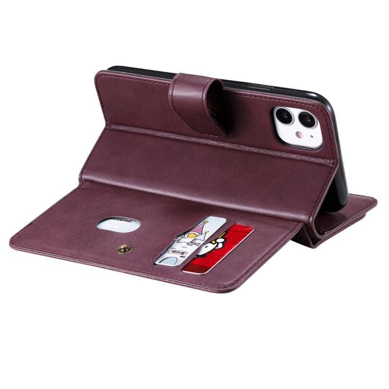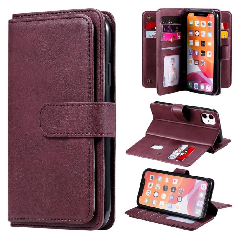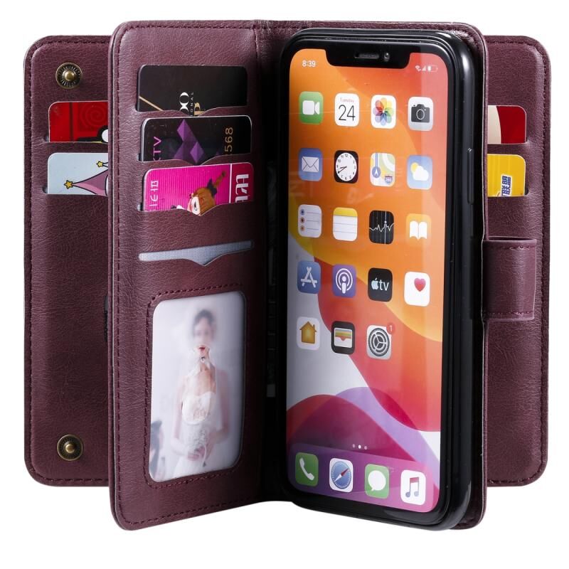 Θήκη για iPhone 11, πολυλειτουργική, μαγνητική, με αγκράφα από χαλκό, οριζόντια, μονόχρωμη, από δέρμα, με 10 υποδοχές για κάρτες, πορτοφόλι, βάση στήριξης & κορνίζα φωτογραφιών (Κρασί)