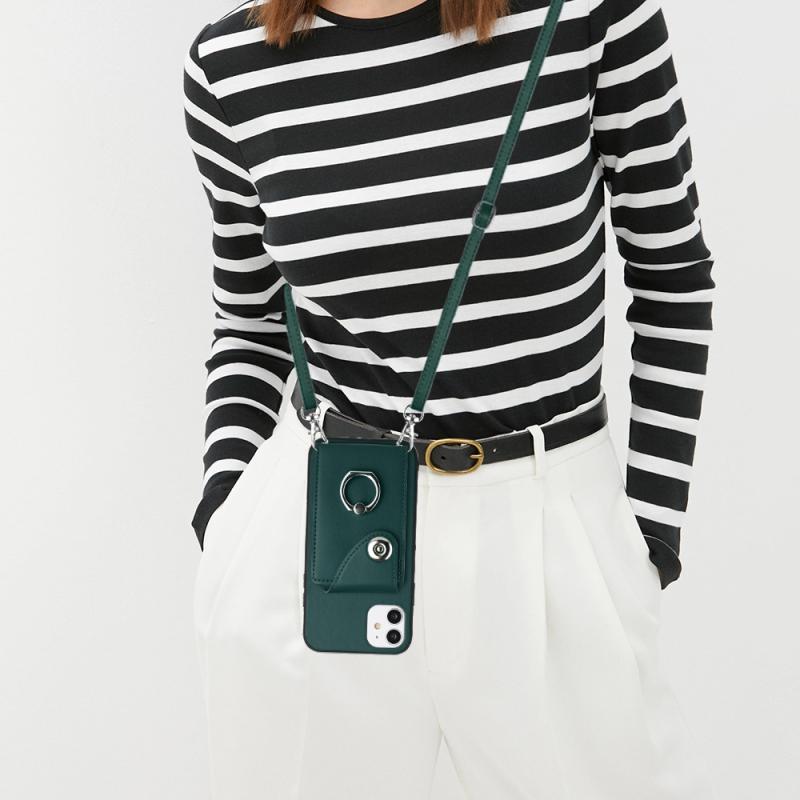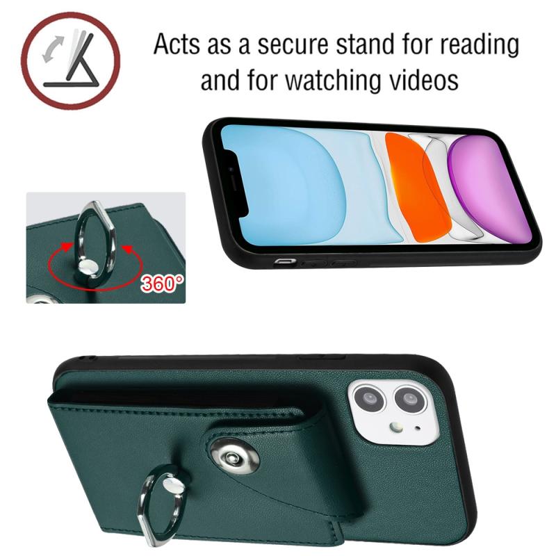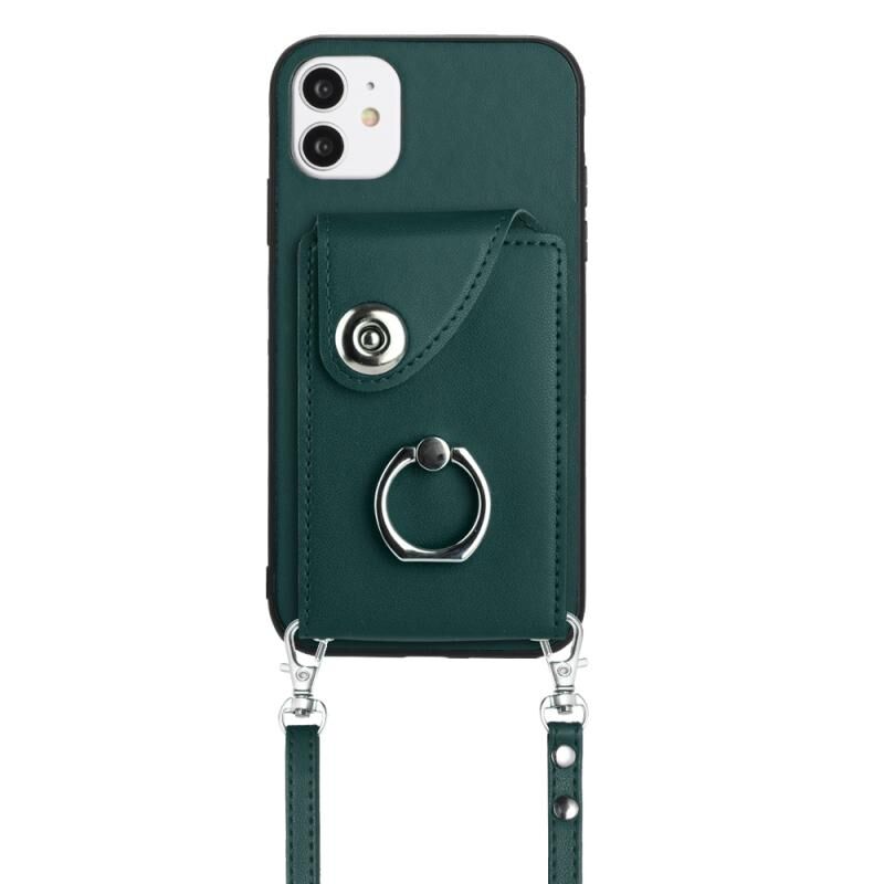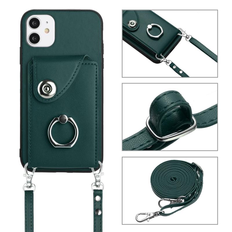 For iPhone 11 Organ Card Bag Ring Holder Phone Case with Long Lanyard(Green)
