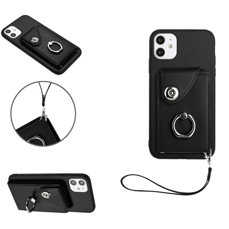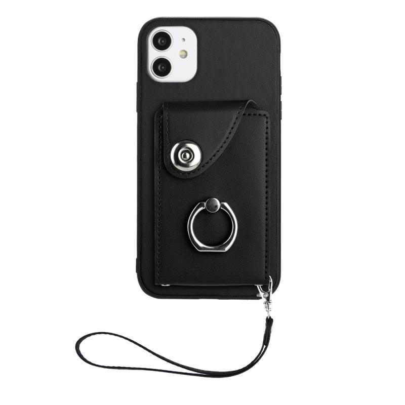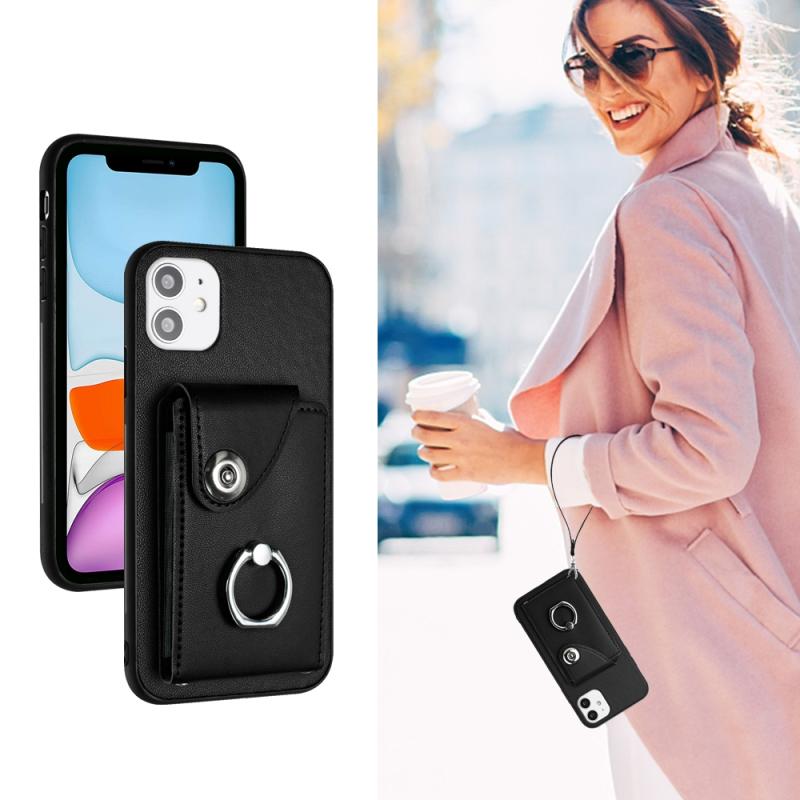 For iPhone 11 Organ Card Bag Ring Holder PU Phone Case with Lanyard(Black)