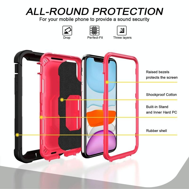For iPhone 11 PC + Rubber 3-layers Shockproof Protective Case with Rotating Holder (Black + Rose Red)
