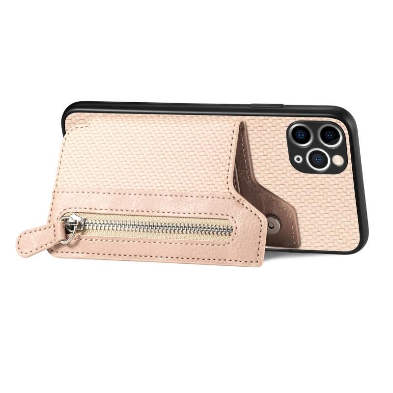 For iPhone 11 Pro Carbon Fiber Horizontal Flip Zipper Wallet Phone Case(Khaki)