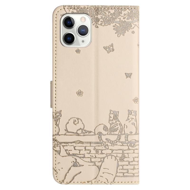 For iPhone 11 Pro Cat Embossing Pattern Leather Phone Case with Lanyard(Beige)
