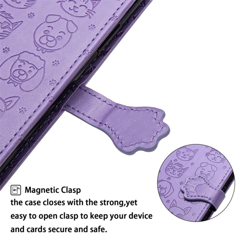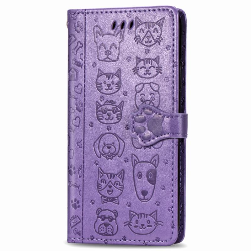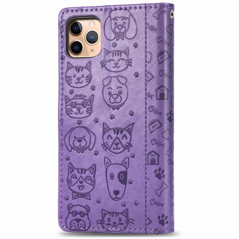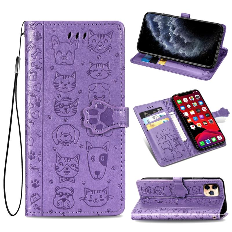 For iPhone 11 Pro Cute Cat and Dog Embossed Horizontal Flip PU Leather Casewith Holder / Card Slot / Wallet / Lanyard(Purple)
