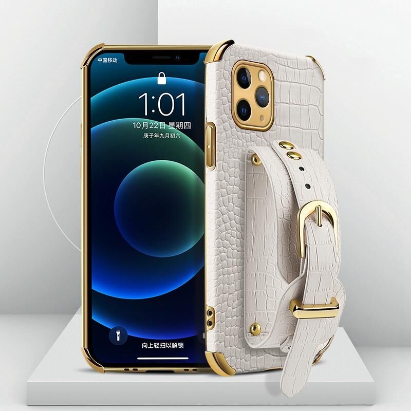 For iPhone 11 Pro Electroplated TPU Crocodile Pattern Leather Case with Wrist Strap (White)